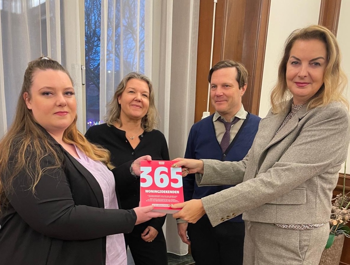 De wooncrisis gaat niet om woningen, maar om mensenlevens. In de regio Rotterdam zijn ruim 100.000 actief woningzoekenden. 365 van hen krijgen een gezicht in de ‘365 Woningzoekenden Scheurkalender 2025’. Op donderdag 12 december nam wethouder Ivana Somers (van Bouwen en Wonen) deze kalender in ontvangst uit handen van woningzoekende Mandy in Vlaardingen, in bijzijn van Barbara van Steen, directeur Wonen & Vastgoed van Waterweg Wonen, en directeur-bestuurder Mark van de Velde van Samenwerking.